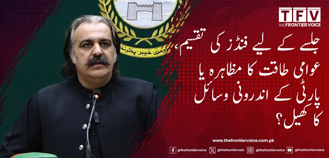 پشاور میں وزیراعلیٰ خیبرپختونخوا علی امین گنڈاپور کی زیر صدارت ایک اہم اجلاس ہوا جس میں 27 ستمبر کو ہونے والے پی ٹی آئی جلسے کی تیاریوں کا جائزہ لیا گیا۔ پارٹی ذرائع کے مطابق اجلاس میں بڑے پیمانے پر فنڈز کی تقسیم کا فیصلہ کیا گیا۔ پشاور کے ایم پی ایز کو 5 لاکھ، قومی اسمبلی کے ممبران کو 3 لاکھ، جبکہ آؤٹ ڈسٹرکٹ کے اراکین کو 7 لاکھ روپے فراہم کیے جائیں گے۔ اس کے علاوہ انصاف یوتھ ونگ اور پارٹی وکلا کو بھی 5، 5 لاکھ روپے دینے کا فیصلہ کیا گیا ہے۔