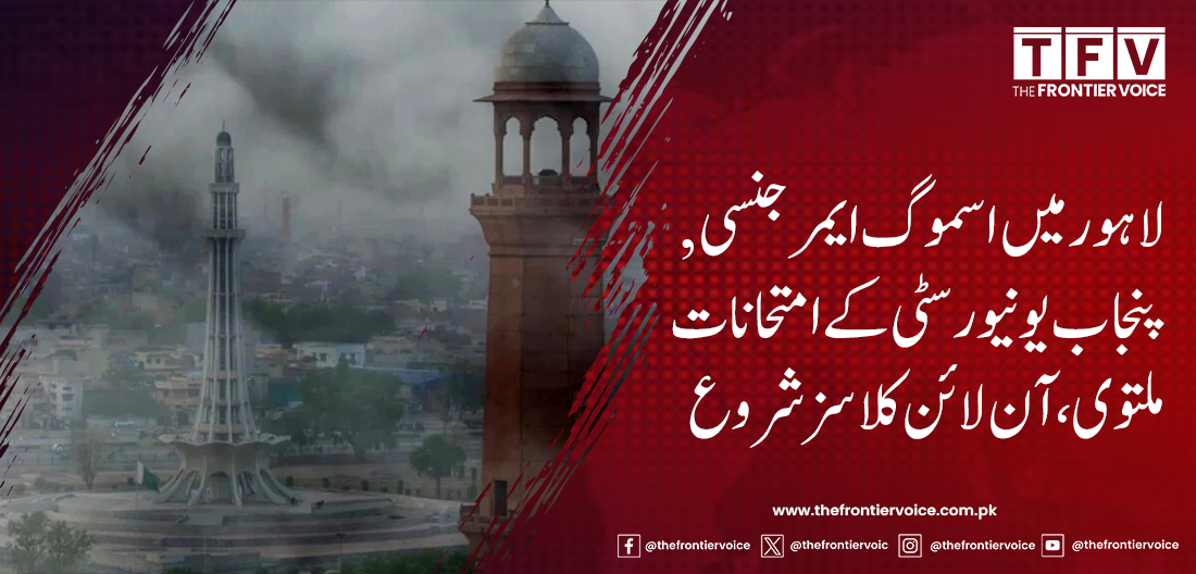 پنجاب یونیورسٹی نے لاہور میں بڑھتی ہوئی اسموگ کے باعث تمام امتحانات ملتوی کر دیے ہیں۔ یونیورسٹی حکام نے اعلان کیا ہے کہ نئے امتحانی شیڈول کا اعلان بعد میں کیا جائے گا۔ تعلیم تسلسل برقرار رکھنے کے لیے تمام کالجز کے اساتذہ کو آن لائن کلاسز کی ہدایت دی گئی ہے۔
